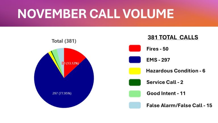 November’s Call Volume Fires – 50 EMS Calls – 297 Hazardous Conditions – 6 Service Calls – 2 Good Intent Calls – 11 False Alarms – 15