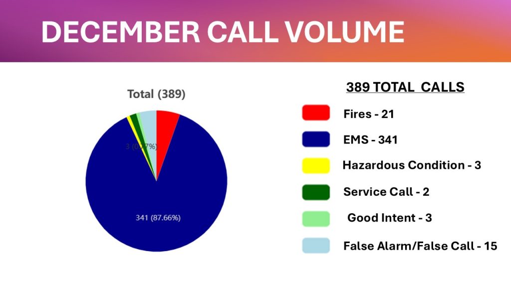 Fires – 21 EMS Calls – 341 Hazardous Conditions – 3 Service Calls – 2 Good Intent Calls – 3 False Alarms – 15